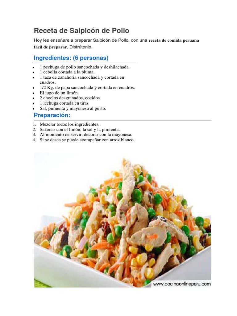 Receta de Pollo a la Olla Peruano. Agregar las arvejas echar un chorrito de jugo de limón y mayonesa al gusto. Vegetales pollo huevo entre otros. El salpicón me encanta comerlo por su frescura y su sencillez. Salpicón de pollo. Deleita tu paladar y el de tu familia con esta fresca receta. Ingredientes y paso a paso para cocinar este plato.